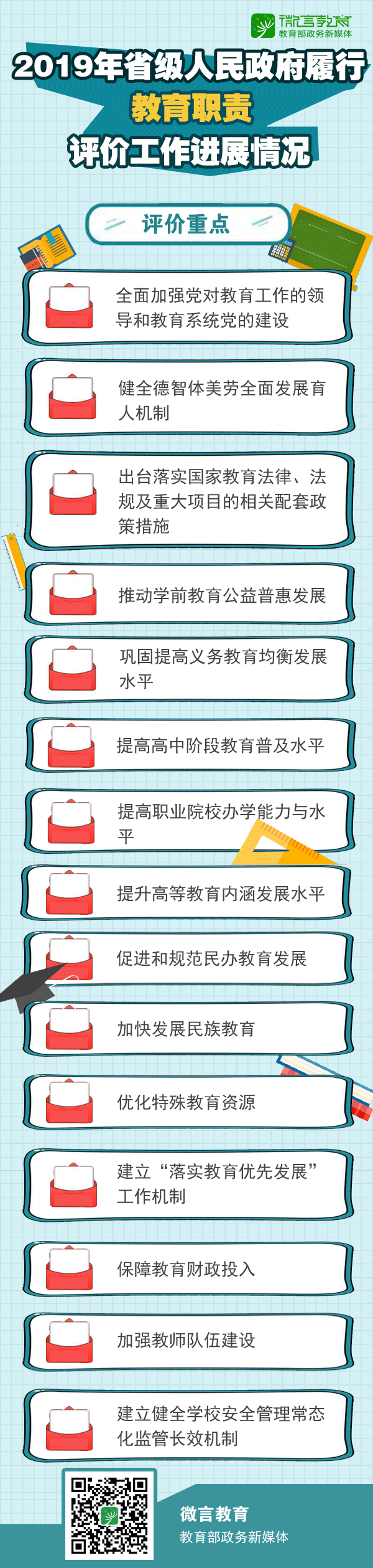 评价各省级人民政府2018年履行教育职责情况、2019年相关重点工作落实情况和2017年履行教育职责评价发现问题的整改落实情况。重点评价以下15项教育职责的履行情况: