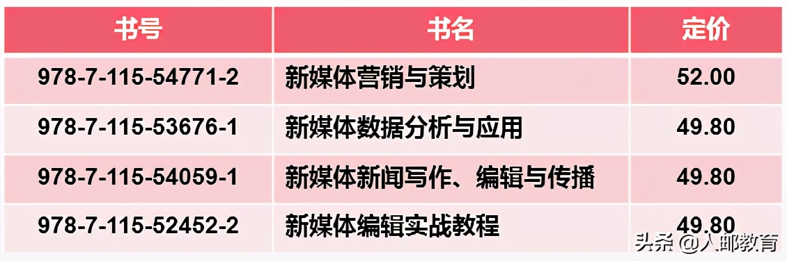 为了更好地服务全国院校的新媒体专业建设和人才培养,人民邮电出版社与人民网舆情数据中心人民慕课联合推出了“新媒体创新人才培养系列丛书”,目前已正式出版四本教材,欢迎广大院校教师参考选用!