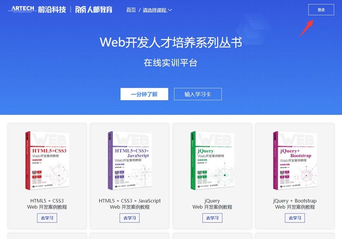 用户打开在线实训平台(http://code.artech.cn)主页后,单击右上角的“登录”按钮,微信扫码即可登录。