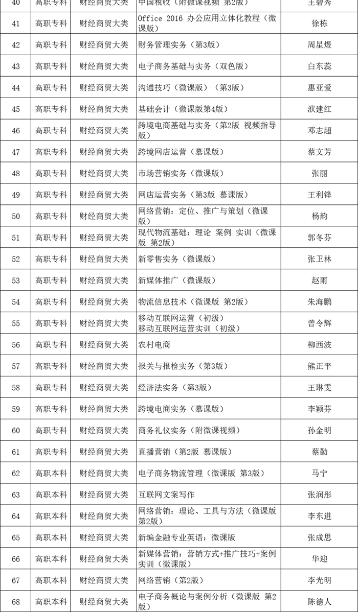 人民邮电出版社共有293种教材入选,涵盖电子与信息大类115种、财经商贸大类68种、公共基础课18种、新闻传播大类7种、文化艺术大类17种、交通运输大类22种、装备制造大类39种、教育与体育大类5种、能源动力与材料大类及公共管理与服务大类各1种。